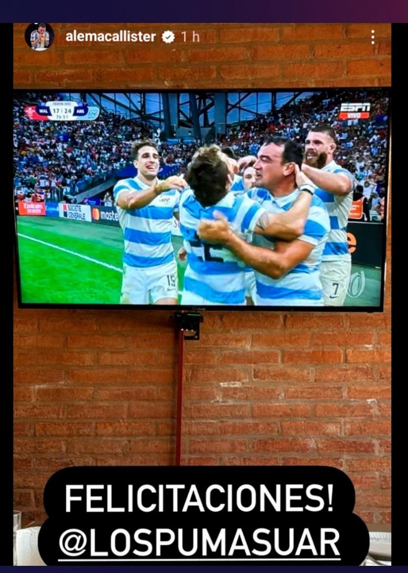 Luego, dos campeones del mundo de la selección de fútbol siguieron esa línea: Alexis Mac Allister, quien escribió “Felicitaciones @lospumasuar” y de Nicolás Tagliafico, quien destacó: “Semifinales @lospumasuar” adjuntando un sticker de un corazón.
