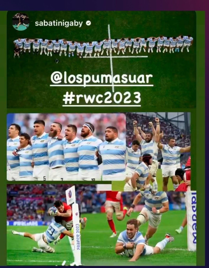 Una gran figura del tenis y del deporte argentino como Gabriela Sabatini compartió en una historia varias fotos de Los Pumas y escribió “Emoción y Garra @lospumasuar”, mientras que el Chino Diego Simonet, figura del handball nacional, destacó: “Vamos @lospumasuar, a semifinales”.