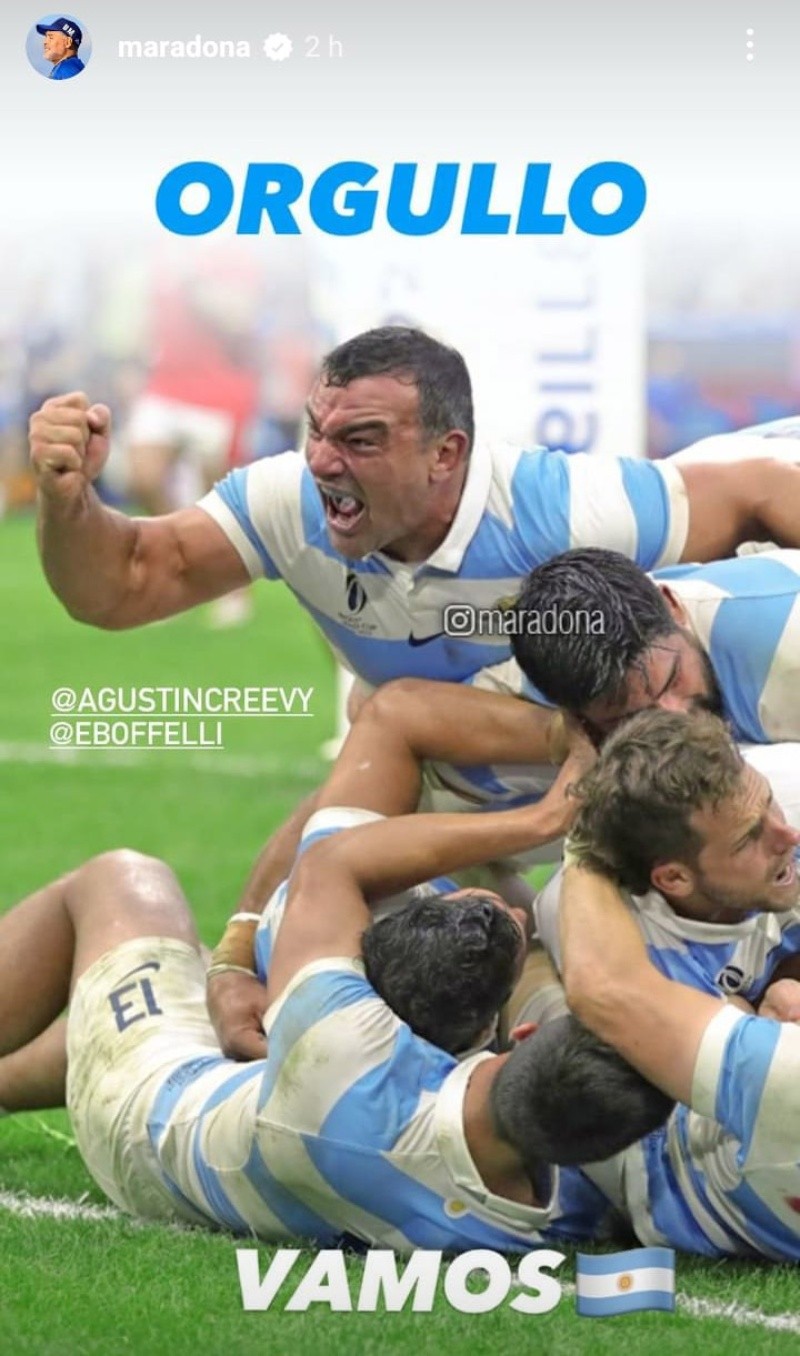 Uno de los saludos más emotivos llegó desde la cuenta oficial de Instagram de Diego Maradona, en la que se destacó una foto de Agustín Creevy -quien supo tener una gran relación con Maradona- con el brazo en alto, acompañado de un texto que rezaba “Vamos, Orgullo” y en el que se arrobaba al propio Creevy y a Emiliano Boffelli.