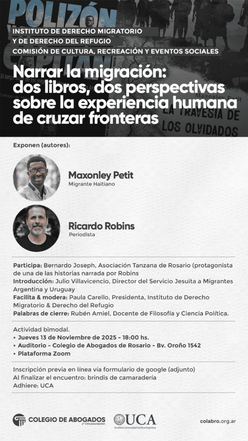 “Narrar la migración: dos libros, dos perspectivas sobre la experiencia humana de cruzar fronteras” es el título del encuentro que se realizará este jueves a las 18 en el auditorio del Colegio de Abogados de Rosario, bulevar Oroño 1542.