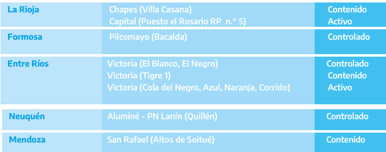 Asimismo, en La Rioja se registraba un único foco activo en la Capital, en el Puesto el Rosario, ruta provincial número 5), en tanto, se encuentra contenido el de Villa Casana, en el departamento de Chapes.
