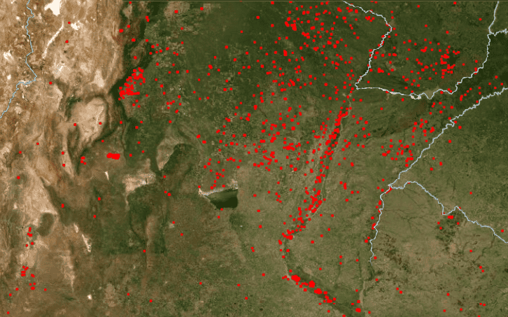 Esa información traducida en el mapa satelital del sitio Firms (Nasa) era un mar de puntos rojos desde el humedal hasta el norte del país y la región.