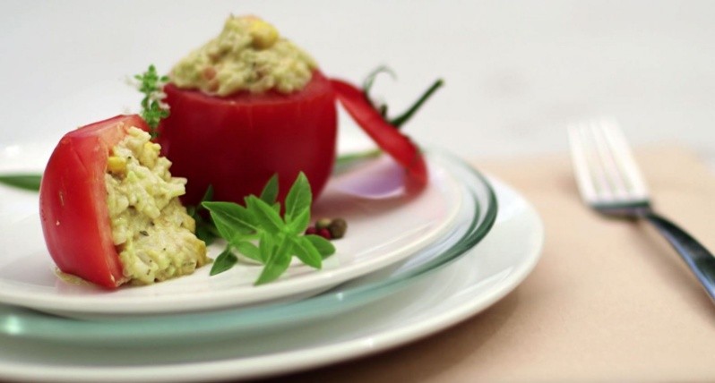 Los ingredientes que se necesitan se consiguen en cualquier dietética y verdulería. Seis tomates (o la cantidad que se pretenda cocinar), 1 taza y ½ de arroz hervido, ½ lámina de alga nori, 3 cucharadas de mayonesa vegana, 100 gramos de garbanzos cocidos, 2 cucharadas de jugo de limón, un poco de aceite y sal a gusto.