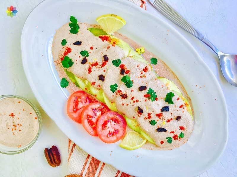 Dejar enfriar y licuar todos los ingredientes de la salsa. Reservar en la heladera. Cortar rodajas finas del seitán. Colocarlas sobre un plato/fuente con una base de salsa y terminar con más salsa por encima. Si se cocina de un día antes los sabores se concentran y es más rico.