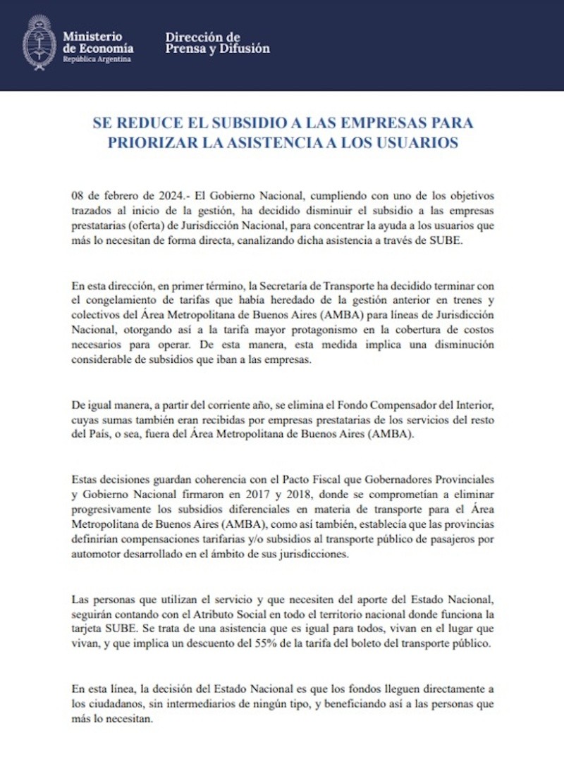 “Estas decisiones guardan coherencia con el Pacto Fiscal que gobernadores provinciales y gobierno nacional firmaron en 2017 y 2018, donde se comprometían a eliminar progresivamente los subsidios diferenciales en materia de transporte para el Amba, como así también, establecía que las provincias definirían compensaciones tarifarias y/o subsidios al transporte público de pasajeros por automotor desarrollado en el ámbito de sus jurisdicciones”, argumentaron.