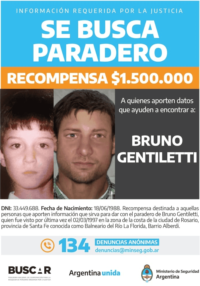 El Ministerio de Seguridad de la Nación oficializó este jueves una recompensa de 1.5 millones de pesos para quienes aporten datos sobre el paradero actual de Bruno Gentiletti. El joven, que en junio cumpliría 34 años, fue visto por última vez el 2 de marzo de 1997 en la zona de La Florida y desapareció sin dejar rastros.