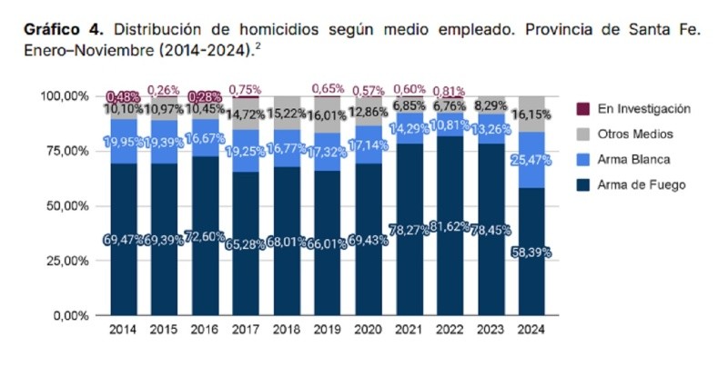 En la argumentación de las razones que lo llevaron a presentar el escrito, Caruana menciona una medida “transitoria y excepcional” adoptada en la ciudad de Santa Fe en octubre de 2014, cuando se suspendió por el lapso de 90 días la venta de municiones y armas, en un intento de contribuir a disminuir el clima de violencia en la región ante la ola de homicidios récord que se registró en esa época. También sostiene que los datos del Observatorio de Seguridad Pública (OSP) de Santa Fe, en el período de 2014 a 2021, muestran que en entre siete y nueve de cada diez homicidios cometidos en la provincia se utilizaron armas de fuego. “La eliminación de requisitos para venta, tenencia y portación de armas” aduce una “libertad que resulta engañosa por diversas razones, ya que una vez que el número de armas en la sociedad crece, los riesgos que se derivan son para todos”, explica. “Aún quienes ejercen su libertad de no tener armas sufren las consecuencias violentas de que más personas estén armadas y la experiencia demuestra que estas consecuencias impactan en las calles, en las escuelas y en los hogares”, evalúa. El impacto de una mayor circulación de armas legales en mayores facilidades para el crecimiento del mercado ilegal es otro de los argumentos del proyecto, anclado en el caso de Brasil, donde a partir de la flexibilización de las condiciones de acceso para las personas, el resultado fue un “crecimiento exponencial de la cantidad de armas en manos de la población, a través de redes de tráfico en las que se recluta a personas (en su mayoría pobres), se les gestiona la licencia para el uso legal, corriendo con los gastos de esos trámites y de la compra del armamento, y luego de denunciar un falso robo del arma, se las desvía hacia el mercado negro”. El extitular de la cartera de salud municipal expuso además que el aumento de la cantidad de armas en circulación multiplica los riegos a los que están expuestos los adolescentes. “Está relevado –explica– que los que cuentan con fácil acceso a armas tienen tasas de suicidio más altas que los que no viven en hogares con armas, en tanto los riesgos de disparos involuntarios y de violencia escolar y comunitaria se incrementan con el acceso a las armas de fuego en el hogar”. El texto quiere establecer la prohibición en todo el ámbito territorial de la jurisdicción municipal de Rosario la comercialización de armas de fuego a menores de 21 años. Para eso, propone modificar el artículo 4 de la ordenanza N° 8761 para que el Ejecutivo local instrumente un sistema informático de uso obligatorio para las personas, locales y lugares vinculados al comercio legal de armas de fuego. Establece que deben registrarse los datos personales del vendedor y comprador: nombre y apellido o razón social, domicilio, documento de identidad, C.U.I.T., edad (mayor de 21 años), datos del legajo de usuario según el manual registral y/o de la Tarjeta de Control de Consumo de Municiones, según corresponda. También sobre armas, municiones y materiales controlados: marca, tipo, calibre y número de serie correspondientes. Y las operaciones: fecha, tipo y número de comprobante y cantidad. Los tipos de operaciones se consideran: compra, venta, importación, exportación, devolución, recarga, reparación, montaje, entre otras. El sistema informático será independiente de los controles, fiscalizaciones y registros dispuestos por las autoridades nacionales y/o provinciales. La carga de cada operación deberá efectuarse de manera inmediata a su realización por los propios sujetos mencionados en el primer párrafo, mediante formulario del sistema informático". En caso de incumplimiento de lo dispuesto, propone que se apliquen las sanciones dispuestas en el artículo 204 del Código de Convivencia Municipal “por incumplimiento de la normativa vigente en la habilitación de armerías”. ¿Qué implicancia tienen las armas de fuego en los episodios con heridos y homicidios en Santa Fe? Según el último reporte del OSP, durante los once meses transcurridos de 2024 se contabilizaron 161 víctimas de homicidios en la provincia de Santa Fe; 85 en el departamento Rosario y 32 en el departamento La Capital. Se trata de una disminución de la cantidad de homicidios del 55,5% a nivel provincial, del 64,7% en el departamento Rosario y del 52,9% en La Capital con respecto a igual período del año anterior. El número de homicidios cometidos por armas de fuego en la provincia de Santa Fe, en el departamento Rosario y en el departamento La Capital posee los registros más bajos de toda la serie temporal analizada 2014/2024. Se trata de una disminución del 66,9% en el caso de la provincia, 71,6% en el departamento Rosario y del 64,8% en La Capital contra el mismo periodo del año 2023. En los primeros once meses de 2023, casi ocho de cada diez muertes se produjeron por el uso de armas de fuego, mientras que en 2024 representan a cerca de seis de cada diez. Se trata de la presencia relativa del fenómeno más baja de toda la serie temporal. En la última década, el porcentaje más elevado de las muertes producidas por el usar de armas de fuego fue 2022, con el 81,62%. Por su parte, en el departamento Rosario la proporción de muertes cometidas con armas de fuego entre enero y noviembre de 2024 es la más baja de toda la serie temporal. La presente distribución permite mostrar cómo el fenómeno de la violencia ha cambiado su composición este año respecto de los anteriores: la modalidad de arma de fuego es la más importante, pero al disminuir ésta, ha aumentado la prevalencia de casos de armas blancas y de otros medios en relación al resto, alcanzando los porcentajes más altos desde 2016. En cuanto a los heridos por arma de fuego, el reporte del OSP muestra que durante los primeros once meses de 2024 se registraron 750 personas heridas en la provincia de Santa Fe. Se trata de la cifra más baja para el intervalo ene