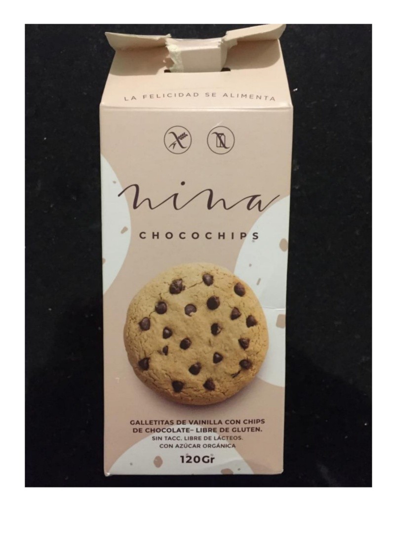 El producto está rotulado como: “Galletitas de vainilla con chips de chocolate. Libre de gluten. Sin TACC. Libre de lácteos. Con azúcar orgánica, marca NINA CHOCOCHIPS, Cont. Neto 120g, RNPA Expte. N° 4119-003496-2018, Elaborado por Nina Felicidad SRL - RNE N° 02-0315199”.