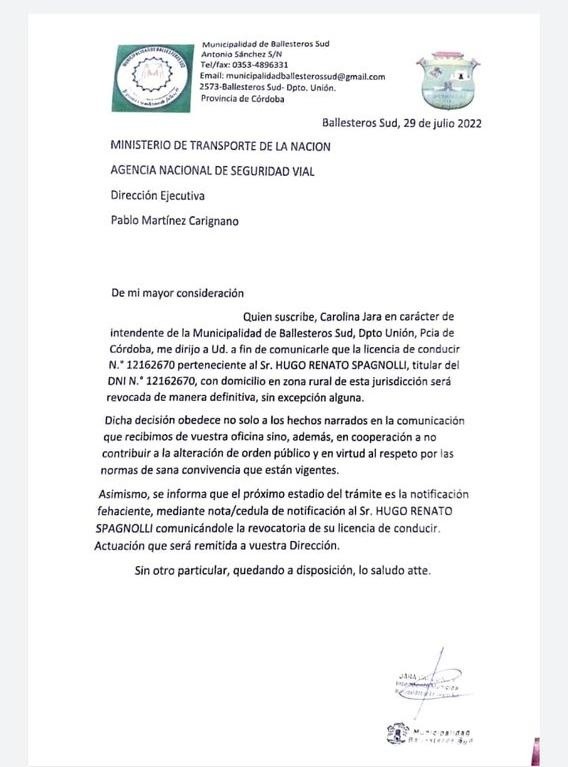 El comunicado de la municipalidad de Ballesteros Sud dejó en evidencia que Hugo Renato S. tenía domicilio "en la zona rural" de esa jurisdicción y estableció la licencia "será revocada de manera definitiva y sin excepción alguna" a raíz de lo sucedido.