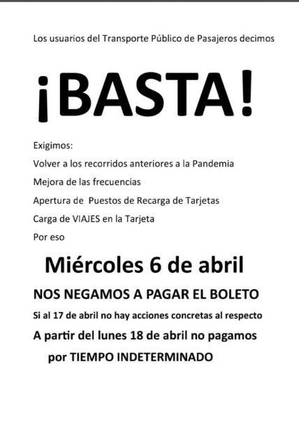 Con respecto a la posibilidad de extender el reclamo, Gershanik anticipó que, “si el municipio no hace caso a esta medida y llegamos al 18 de abril sin soluciones, la decisión de no pagar el boleto será por tiempo indeterminado”.