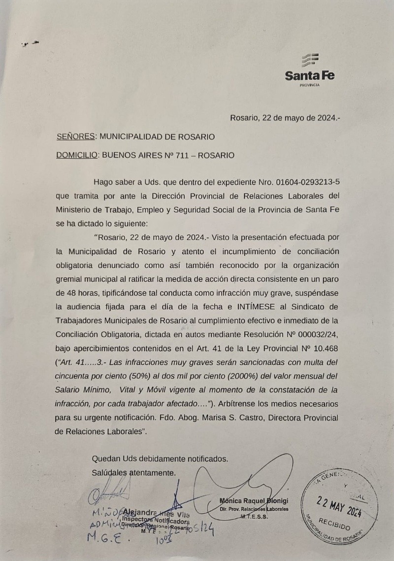 El Ministerio de Trabajo de Santa Fe intimó al Sindicato de Trabajadores Municipales a cumplir la conciliación obligatoria dictada el martes y que el gremio desobedeció este miércoles al sostener el paro de actividades en Rosario, sin atención al público y con guardias mínimas en salud. Además, desde el Gobierno decidieron suspender la audiencia pautada para esta mañana y advirtieron que podrían multar al Sindicato.