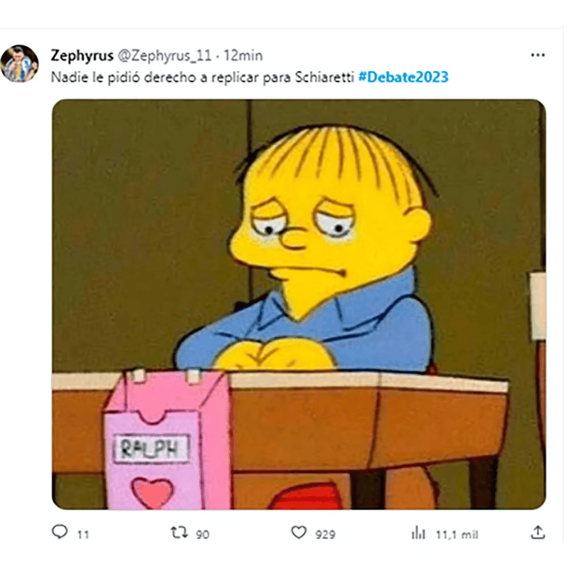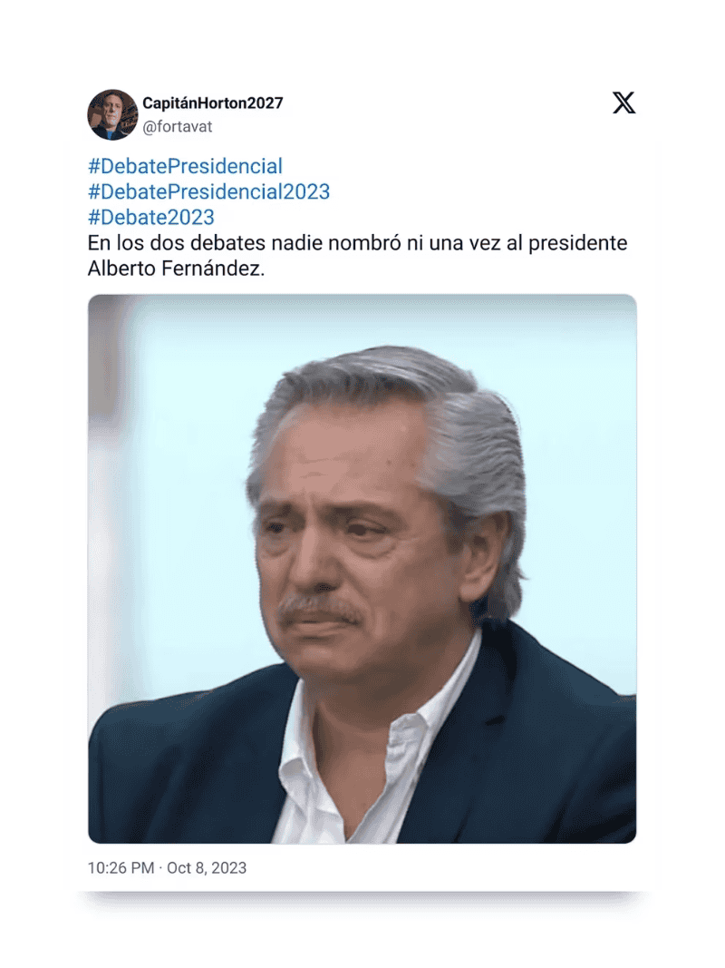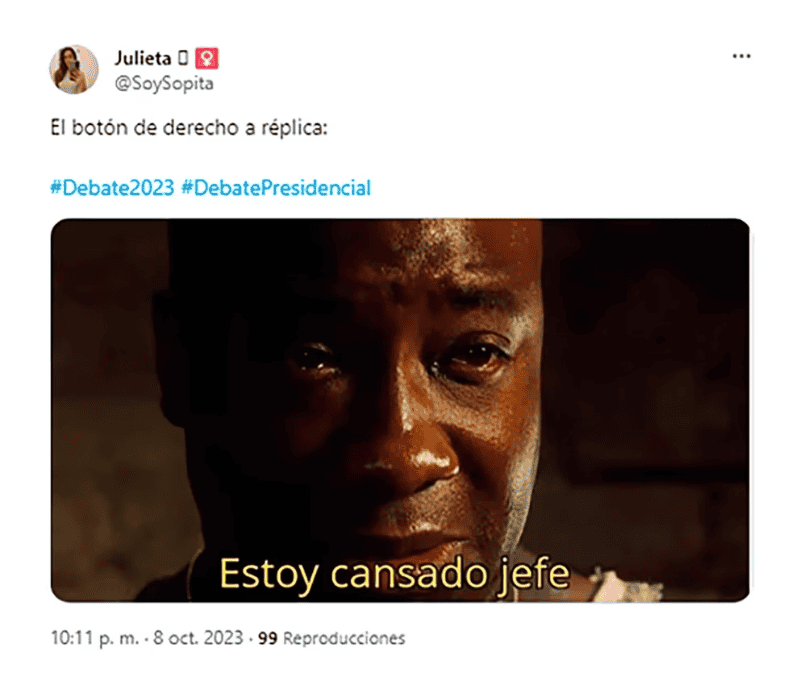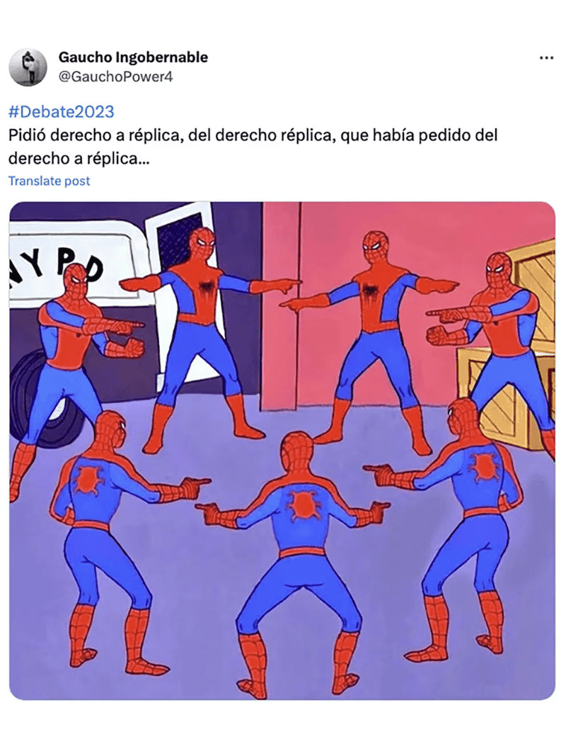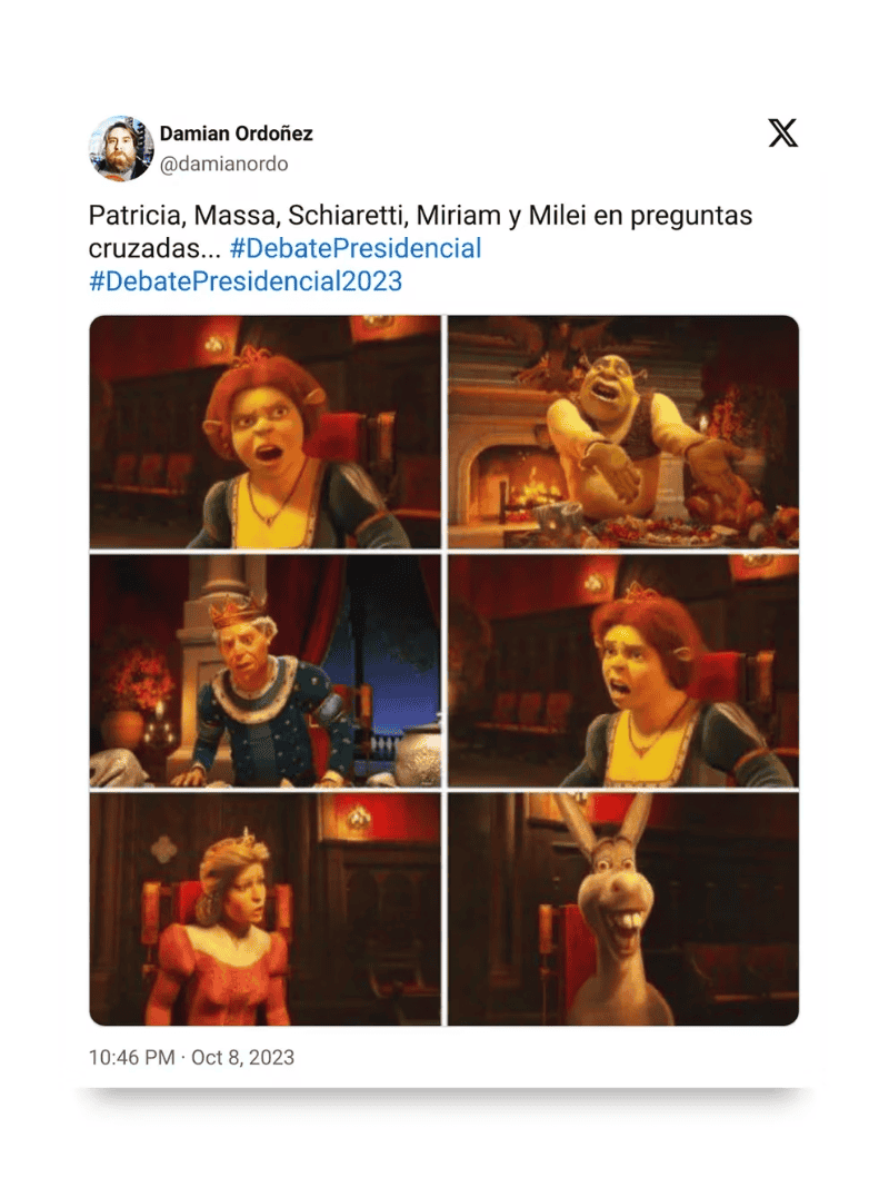 Este domingo por la noche se realizó el segundo debate presidencial de cara a las elecciones del 22 de octubre. Patricia Bullrich (Juntos por el Cambio), Sergio Massa (Unión por la Patria), Javier Milei (La Libertad Avanza), Juan Schiaretti (Hacemos por Nuestro País) y Miryam Bregman (Frente de Izquierda) debatieron, respondieron y expusieron en la facultad de Derecho (UBA) y las redes sociales se llenaron de memes.