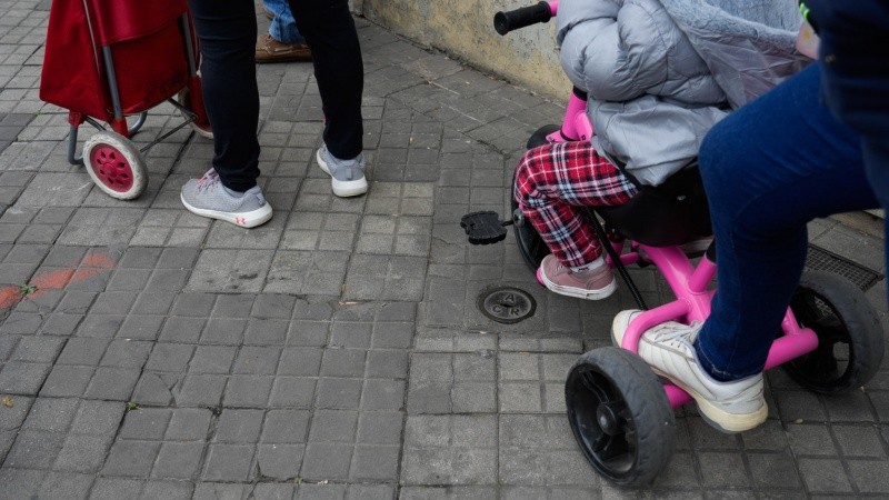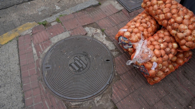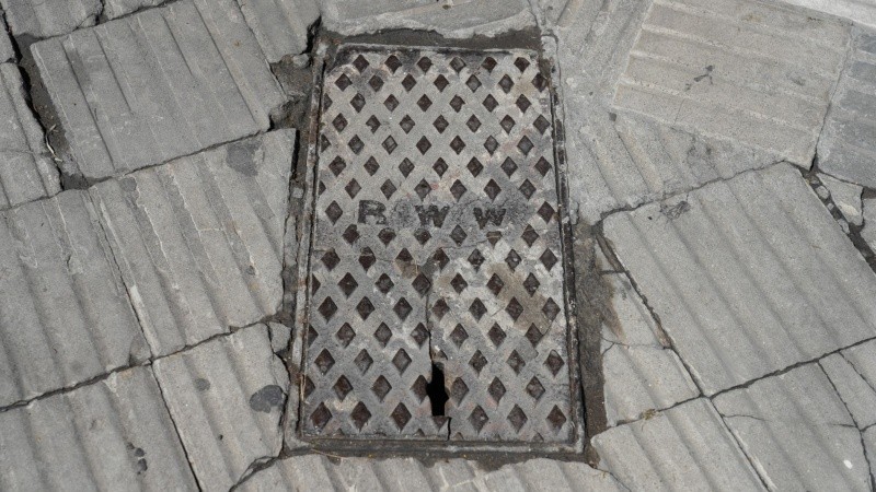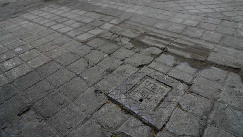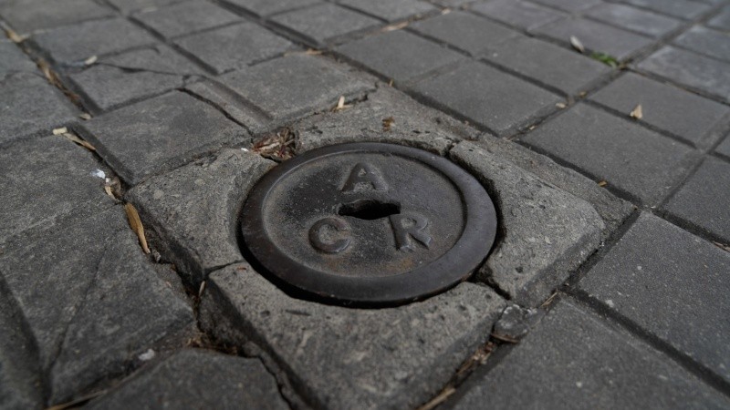 Debajo de la rueda delantera de un cochecito de bebé, frente a una agencia de Lotería y Santa Fe Servicios, asoma una tapa de ACR. Se trata de Aguas Corrientes de Rosario, la firma británica que tomó el servicio en 1888.