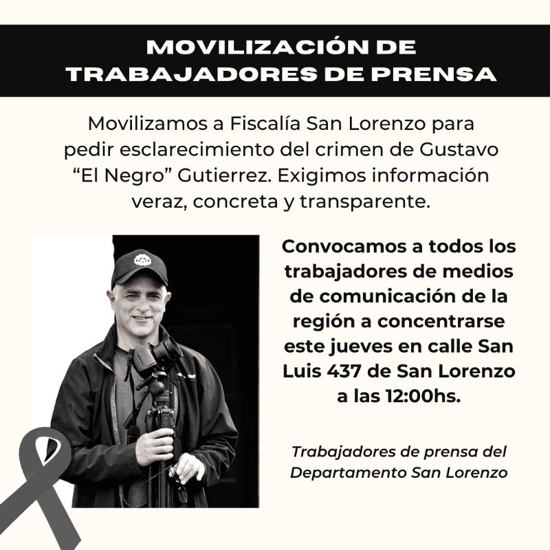 Periodistas de la región se movilizaron este jueves al mediodía a la Fiscalía de San Lorenzo para exigir el esclarecimiento del crimen de Gustavo Gutiérrez, camarógrafo de Televisión Regional, ocurrido durante la madrugada.