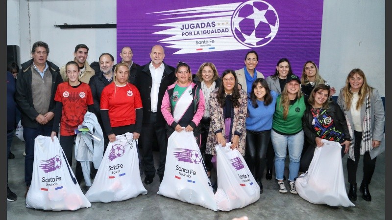 El gobernador de la provincia, Omar Perotti, entregó este viernes kits de fútbol a clubes que compiten en la Liga Rosarina, en el marco del programa “Jugadas por la igualdad”, que tiene como objetivo reconocer y potenciar a los equipos de fútbol femenino de toda la provincia.