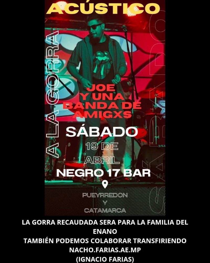 En tanto, Joe Pereyra, otro de sus amigos, publicó en sus redes sociales datos del recital que se desarrollará el próximo sábado en un bar de Pueyrredón y Catamarca para recaudar fondos para la familia.