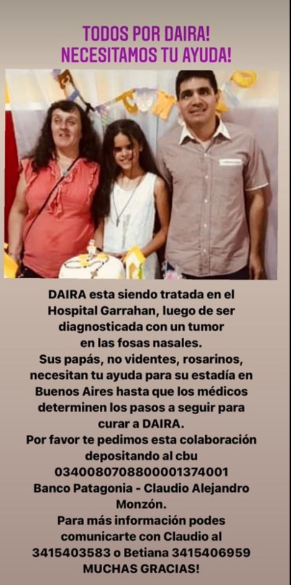 Daira es la hija de Claudio Alejandro Monzón, ex integrante de la selección argentina de fútbol para ciegos, Los Murciélagos, y cumple con un tratamiento médico en el Hospital Garrahan de Buenos Aires. Por tal motivo, se solicita la colaboración a través de un depósito en una cuenta del Banco Patagonia.