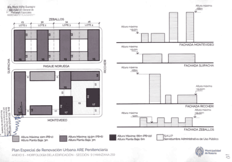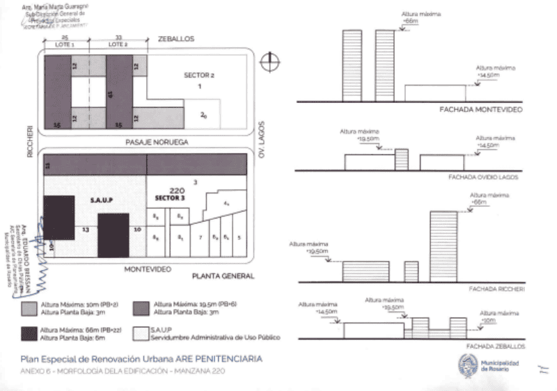 En concreto, tanto por calle Montevideo, como por Richieri, habrá parcelas donde se podrán construir edificios de planta baja de hasta 6 metros de altura y 22 pisos para arriba. Por fuera de esos espacios determinados, el resto de las fachadas no podrán superar los 19.5 metros con lugares habilitados para planta baja y 6 pisos y otros con planta baja y apenas dos pisos más.