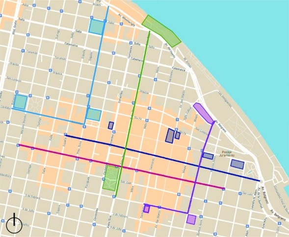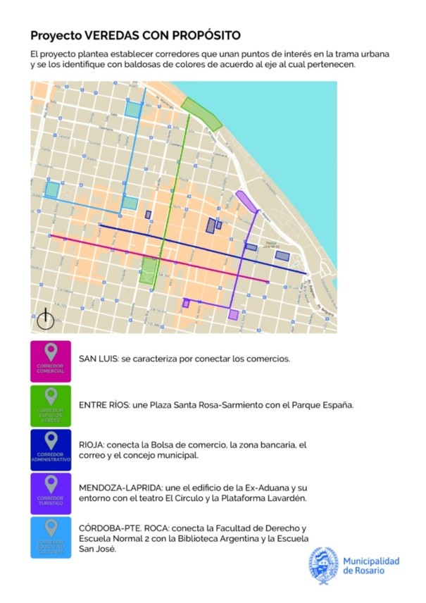 Habrá corredores identificados con baldosas de colores de acuerdo al interés: a través de la calle San Luis (comercial) en color fucsia; en Entre Ríos (espacios verdes) desde la plaza Santa Rosa y plaza Sarmiento hacia el parque España, será de color verde; por calle Rioja (zona bancaria) conecta el correo, el Concejo, bancos y la Bolsa de Comercio, y será de color azul; las arterias Mendoza y Laprida (turístico), conectan la ex Aduana, teatro El Círculo y Plataforma Lavardén, y será de color violeta; y en Córdoba/Presidente Roca (educativo cultural) Facultad de Derecho, Biblioteca Argentina y escuelas, de color celeste.