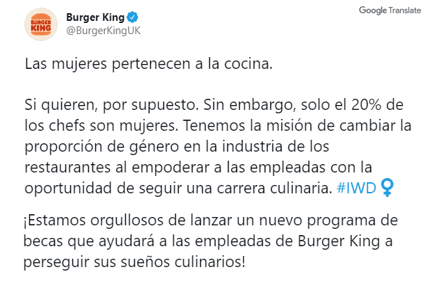 En el Día Internacional de La Mujer, la red social del reconocido local de hamburguesas "Burger King" publicó un hilo de tuits que generó polémica: "Las mujeres pertenecen a la cocina".