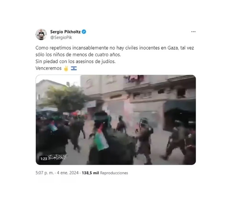 "Como repetimos incansablemente no hay civiles inocentes en Gaza, tal vez solo los niños de menos de cuatro años. Sin piedad contra los asesinos de judíos. Venceremos", escribió en su cuenta, @SergioPik, durante la tarde del jueves.