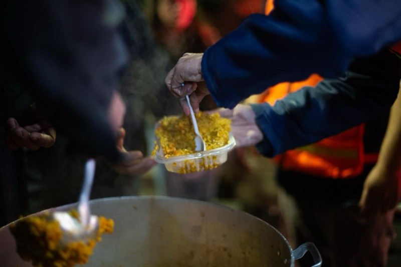 Los Ex Combatientes reparten raciones de comida caliente cada atardecer desde el inicio de las bajas temperaturas. Entregan 350 porciones diarias, que es el máximo que pueden elaborar en la cocina de campaña que tienen. Este miércoles excepcionalmente pudieron sumar 110 más.