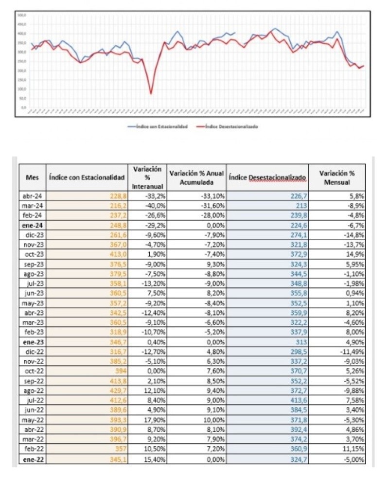 De esta forma, el acumulado enero-abril de 2024 arrojó una baja del 33,1% con relación al primer cuatrimestre de 2023.
