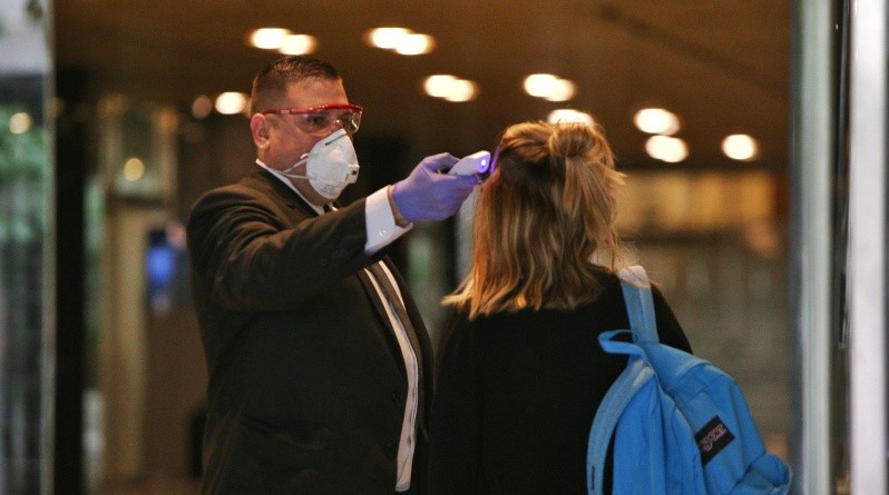 En la puerta de la Bosa de Comercio de Rosario, un empleado con barbijo y con lentes especiales para prevenir contagios, les tomaba la temperatura a las personas que ingresaban al edificio céntrico de la ciudad.