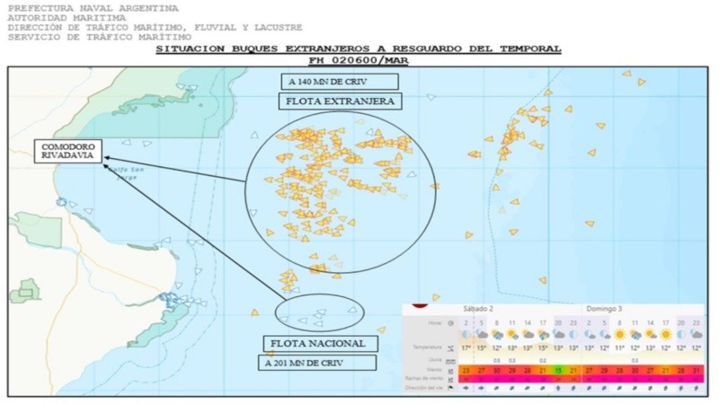 En cuanto a la flota pesquera argentina que se encuentra realizando tareas en el área de incumbencia, la misma ya ha tomado conocimiento e inició navegación para buscar resguardo.