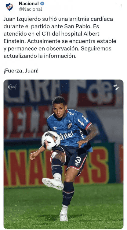 Luego de una espera de horas, finalmente Nacional emitió un comunicado oficial con respecto al estado de su jugador, confirmando su diagnóstico y que efectivamente se encuentra estable. "Juan Izquierdo sufrió una arritmia cardíaca durante el partido ante San Pablo. Es atendido en el CTI del hospital Albert Einstein. Actualmente, se encuentra estable y permanece en observación. Seguiremos actualizando la información. ¡Fuerza Juan!".