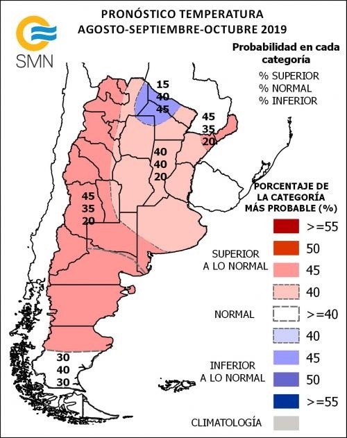 “Arrancamos la recta final del invierno y estamos a solo un mes de empezar la primavera. Se espera que en el trimestre agosto, septiembre y octubre sea más probable que se sigan presentando temperaturas normales o superiores a las normales en casi toda la Argentina”, indicó el parte especial del SMN.