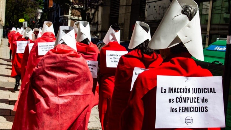 Con el lema “La inacción judicial es cómplice de los femicidios”, las manifestantes realizaron una ronda en silencio alrededor del edificio judicial, vestidas con atuendos inspirados en El cuento de la criada —símbolo del sometimiento patriarcal y la pérdida de derechos—. Al cierre, desplegaron un cartel en las escalinatas con la consigna: “Milei, Pullaro y Javkin nos quieren como criadas. ¡No lo vamos a permitir!”