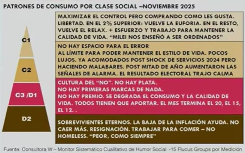La disponibilidad de dinero traza una frontera clara en los hábitos de compra, según el informe de la consultora. Los sectores de la base experimentan lo que el informe define como “la cultura del «no»”. En la “Clase media baja” y la “Clase baja superior” impera la frase “no hay plata”.