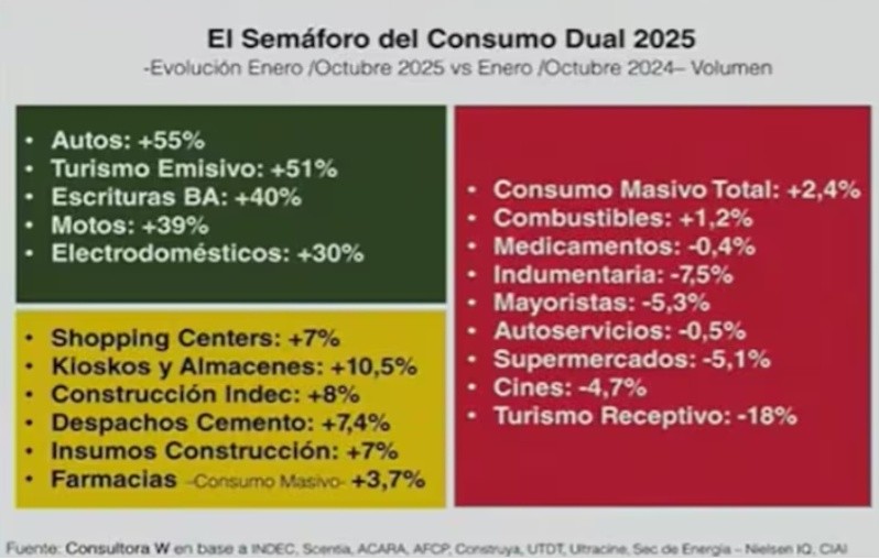 El comportamiento del mercado refleja estas asimetrías. Los autos y los viajes al exterior encabezan la lista de recuperaciones con alzas superiores al 50% interanual en el acumulado entre enero y octubre de 2025, mientras que el turismo receptivo, la indumentaria y los supermercados muestran la otra cara de la moneda con caídas que oscilan entre el 5,1% y el 18%.