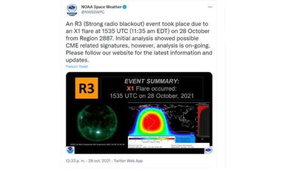Una potente llamarada proveniente del Sol alcanzó a la Tierra este jueves 28 de octubre. Este flujo de radiación impactó principalmente en la parte de la atmósfera que cubre Sudamérica y Centroamérica, donde causó un apagón de radio de alta frecuencia.