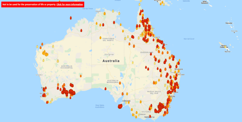 La BBC da cuenta de que este no fue el único caso. Otra imagen muy compartida es la de un mapa con puntos generado por el gobierno de Australia que se compartió en redes con la frase "Todos los incendios activos en Australia".