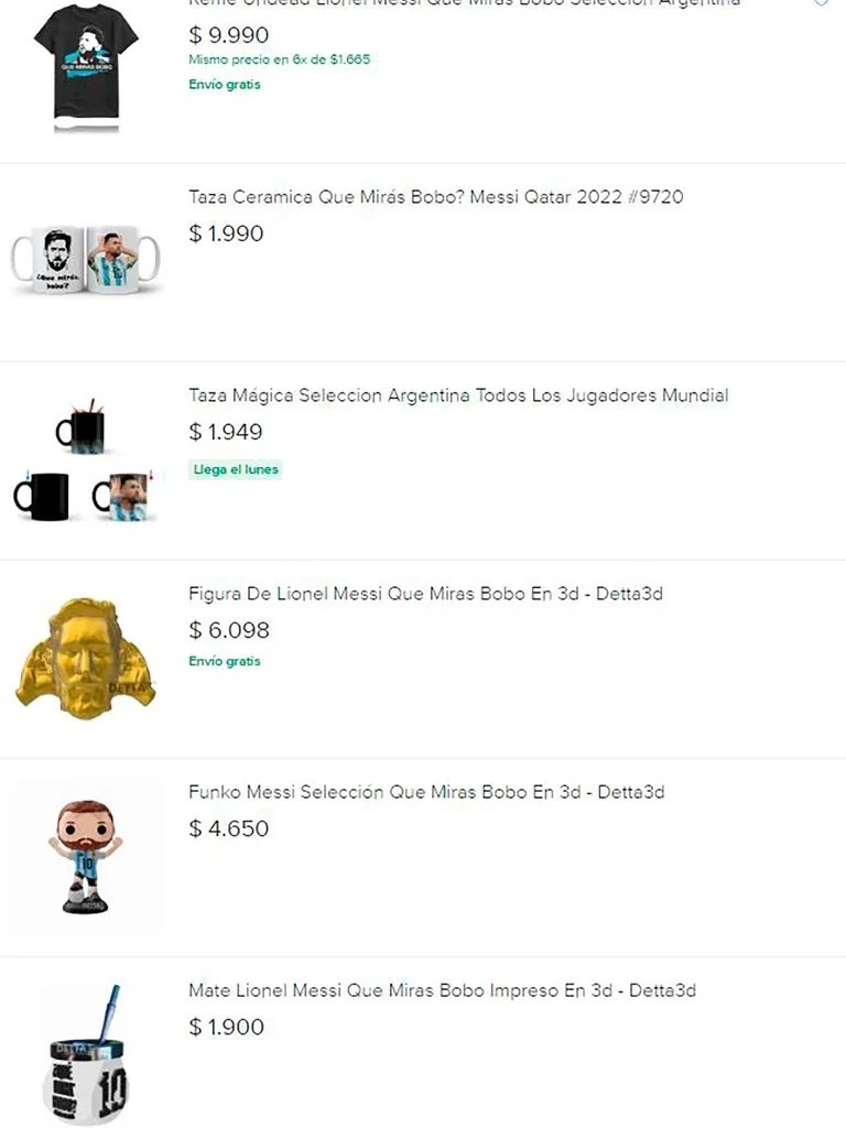 Tras las palabras de Messi, se generó la demanda y aparecieron las ofertas. En Mercado Libre hay, por ejemplo, una extensa variedad de objetos ploteados con “qué mirá’, bobo” y la cara de Leo disponibles para todos los gustos y con una gran gama de precios.