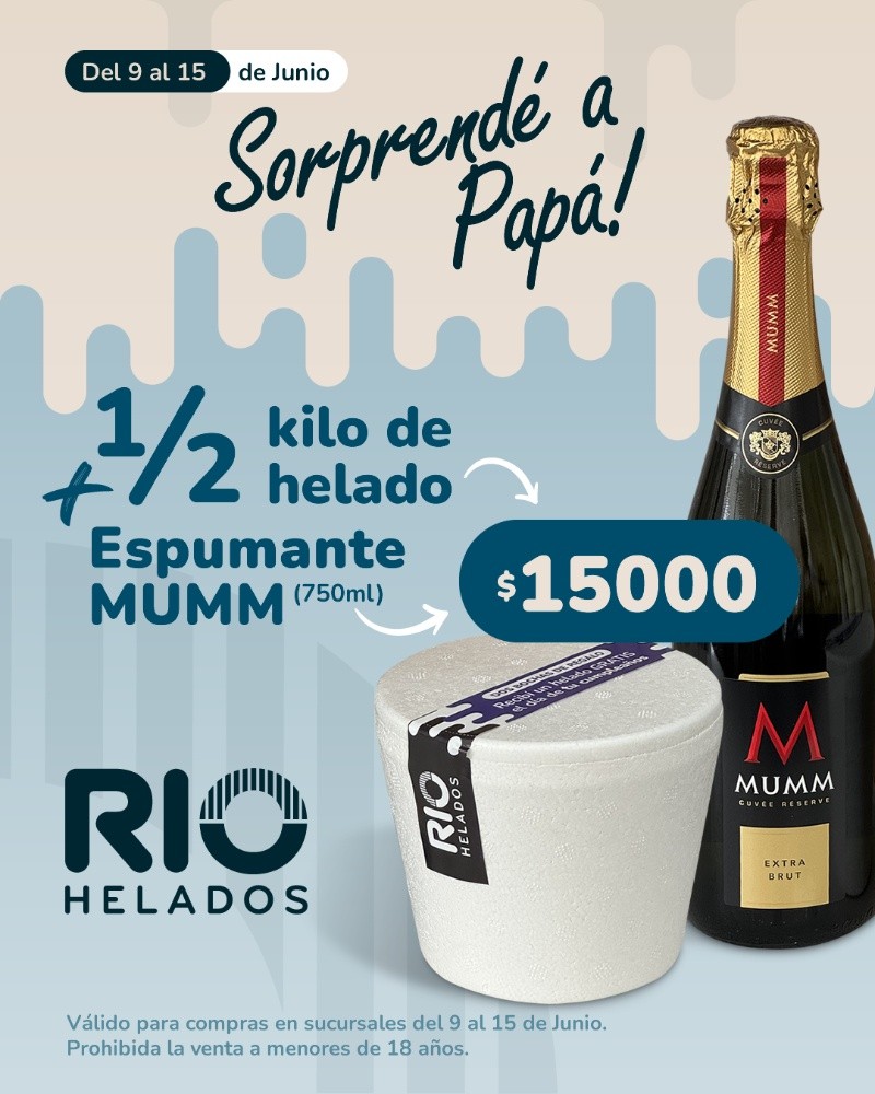Con motivo de la celebración del Día del Padre, en RIO Helados lanzamos una promoción especial para homenajear a quienes siempre están con nosotros. Desde el lunes 9 hasta el domingo 15 de junio inclusive, se podrá acceder a una exquisita propuesta: ½ kilo de helado artesanal + 1 espumante Mumm de 750 ml a solo $15.000.