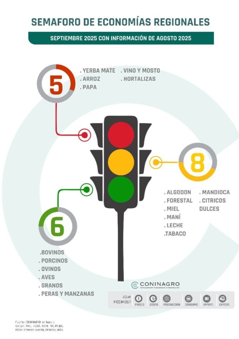 En verde están las cuatro carnes —bovina, porcina, ovina y aviar—, a las que se suman los granos y peras y manzanas. Y en amarillo, quedaron ocho producciones que marchan en situación de alerta: algodón, forestal, miel, maní, leche, tabaco, mandioca y cítricos dulces”, añadió.