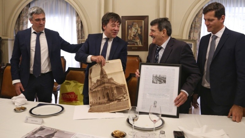 A su vez, Scaglione llevó a la Bolsa una reproducción de la página de La Capital de noviembre de 1929 en la que se informa sobre la inauguración del edificio institucional de Corrientes y Córdoba. También hizo entrega de un suplemento del diario de agosto de 1959 destinado a conmemorar el 75° aniversario de la Bolsa.