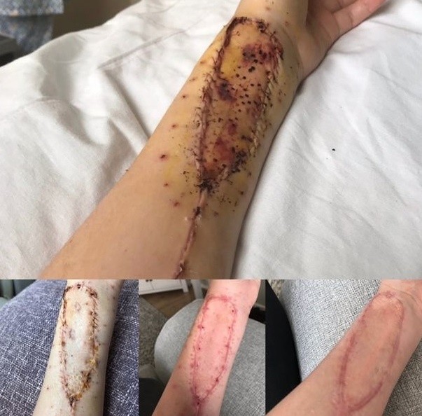 El posoperatorio fue muy complicado: aparte de la enorme cicatriz del brazo, que la limitaba para moverse, de su cuello salían dos drenajes, le habían hecho una traqueotomía y era alimentada por una vía, por lo que tampoco podía moverse con libertad de cuello para arriba.