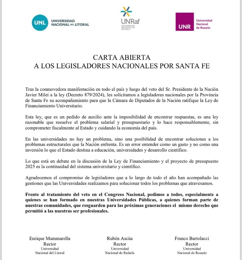 En la antesala a la sesión de Diputados donde se definirá si queda firme el veto o se ratifica la ley de financiamiento universitario, los rectores de las tres universidades nacionales que funcionan en Santa Fe publicaron una carta abierta a los diputados que representan a la provincia.