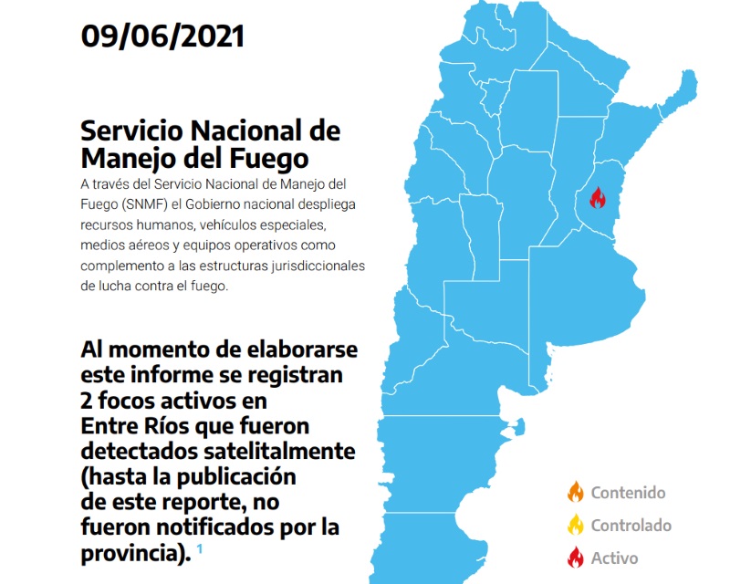 El Servicio Nacional del Manejo del fuego (SNMF) informó este miércoles que registró dos incendios forestales activos en Entre Ríos.
