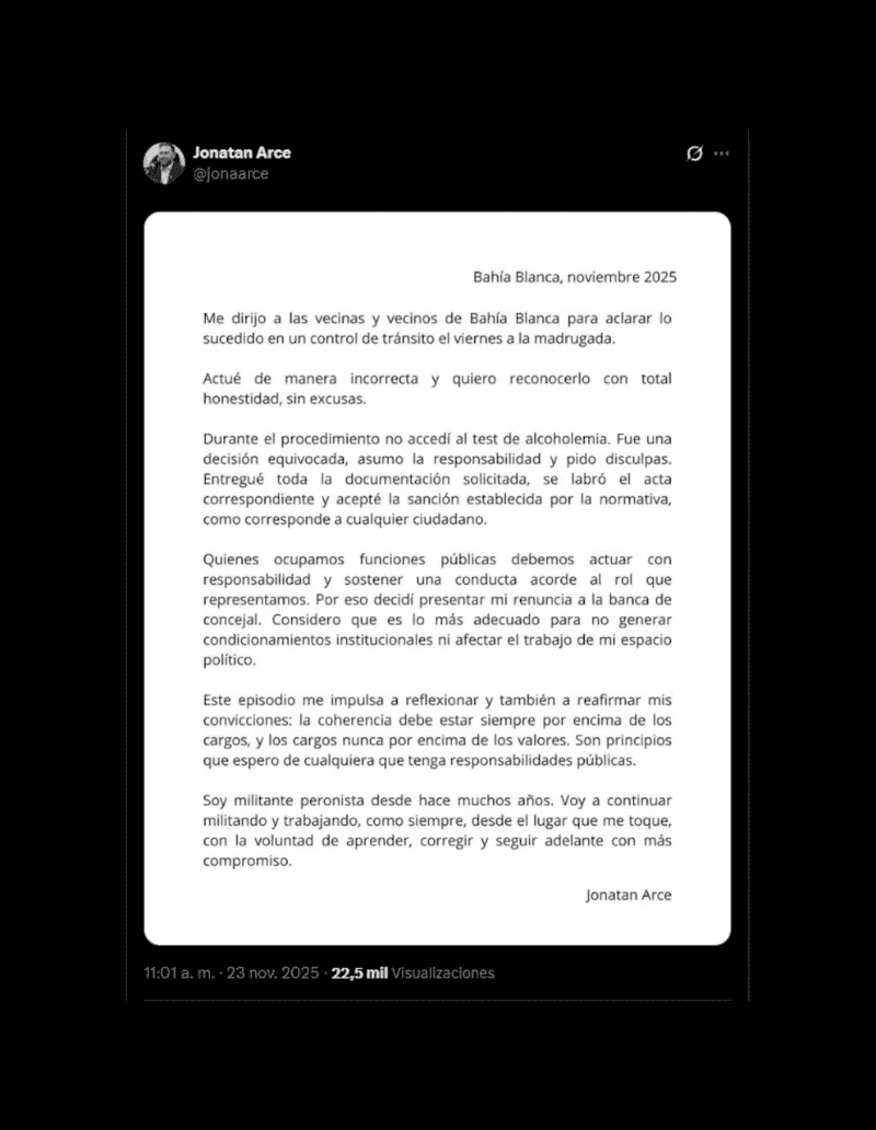 Frente a la repercusión, Arce publicó este domingo una carta en X donde admitió: “Actué de manera incorrecta y quiero reconocerlo con total honestidad, sin excusas”. También señaló: “Durante el procedimiento no accedí al test de alcoholemia. Fue una decisión equivocada, asumo la responsabilidad y pido disculpas”.