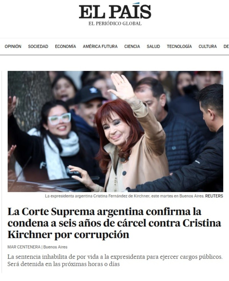 En España, El País de Madrid abrió su edición digital con la foto de la expresidenta bajo el título “La Corte Suprema argentina confirma la condena a seis años de cárcel contra Cristina Kirchner por corrupción”.