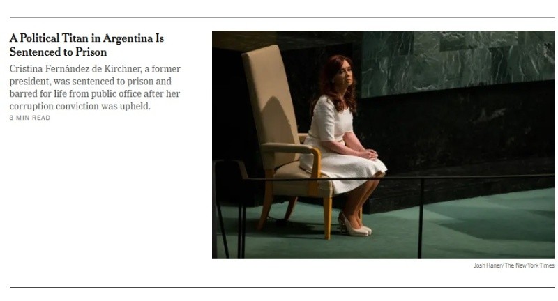 El artículo, firmado por Daniel Politi, señaló que "Cristina Fernández de Kirchner, ex presidenta de Argentina y una de las figuras políticas más polarizantes del país, fue condenada este martes a prisión e inhabilitada de por vida para ejercer cargos públicos, luego de que la Corte Suprema confirmara su condena por corrupción".