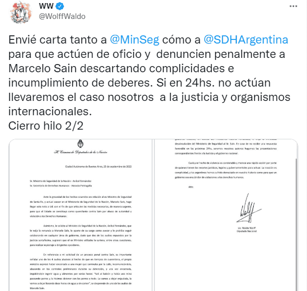 Por su parte, el diputado nacional de Juntos por el Cambio por Buenos Aires Waldo Wolff, envió una carta documento al ministerio de Seguridad y la secretaría de Derechos Humanos de Nación para que “actúen de oficio y denuncien penalmente” a Sain.