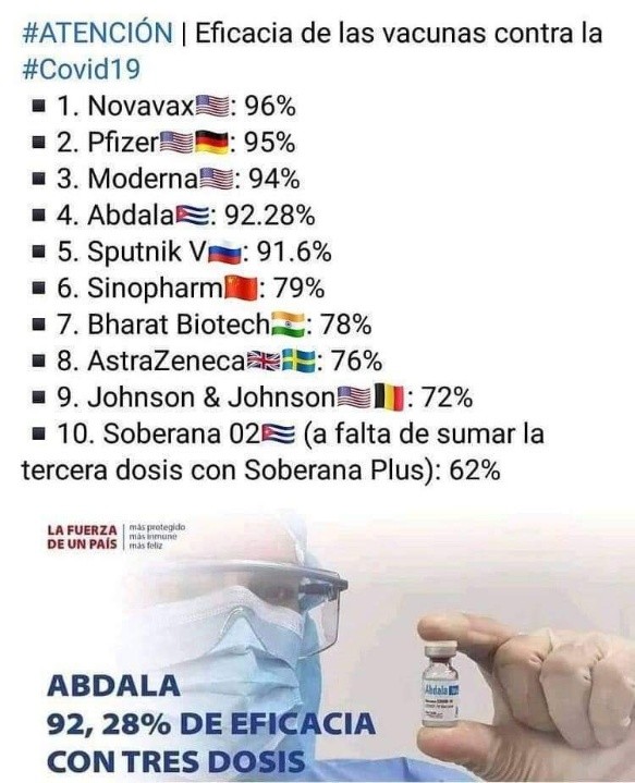Con estos resultados, Abdala pasaría a considerarse oficialmente una vacuna contra la covid-19, ya que los requisitos de eficacia exigidos por la Organización Mundial de la Salud, establecen un 50 por ciento de eficacia para el registro de vacunas.