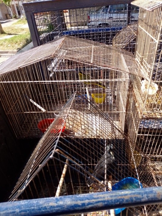 Una vez dentro se procedió a retirar dos perros que a simple vista se los veía mal alimentados y débiles. En tanto que en otras jaulas había un Cardenal Amarillo (ave en peligro de extinción; cinco cardenales colorado y una cacatúa blanca.