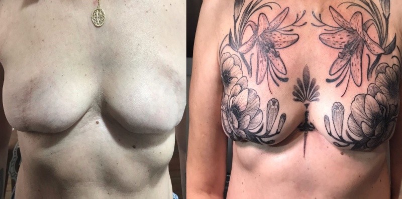 —Todas las experiencias me marcaron pero, hay una en particular que fue la de V. Ella compartió conmigo el proceso de reconstrucción de su propio valor personal en general. Ella tiene una mastectomia bilateral, con mala praxis, infección de por medio y situaciones muy difíciles de atravesar. Una mujer hermosa, profesional e intelectual, una luchadora. Había empezado solo con la idea del pezón y ella misma se dio cuenta que quería algo más grande y bello que contuvieran sus mamas: flores en el lugar de los pezones. Y lo quiso continuar por todo el pecho, ella floreció con este proyecto y me hizo muy feliz acompañarla, contenerla, que me enseñe lo importante que es salir adelante pese a la realidad que se viva. Un ejemplo de vida y lucha interior.